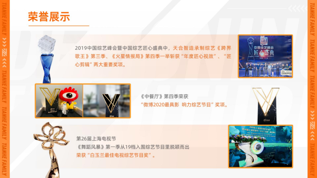 在过去的9年里,我们专注于优质内容策划与创作,承制项目超100档,行业内外合作伙伴超80余家,承制的节目《跨界歌王》第三季、《火星情报局》第四季一举斩获“年度匠心视效”、“匠心剪辑”两大重要奖项;《中餐厅》第四季荣获“微博2020最具影响力综艺节目”奖项;第26届上海电视节《舞蹈风暴》第一季从19档入围综艺节目里脱颖而出荣获“白玉兰最佳电视综艺节目奖”……