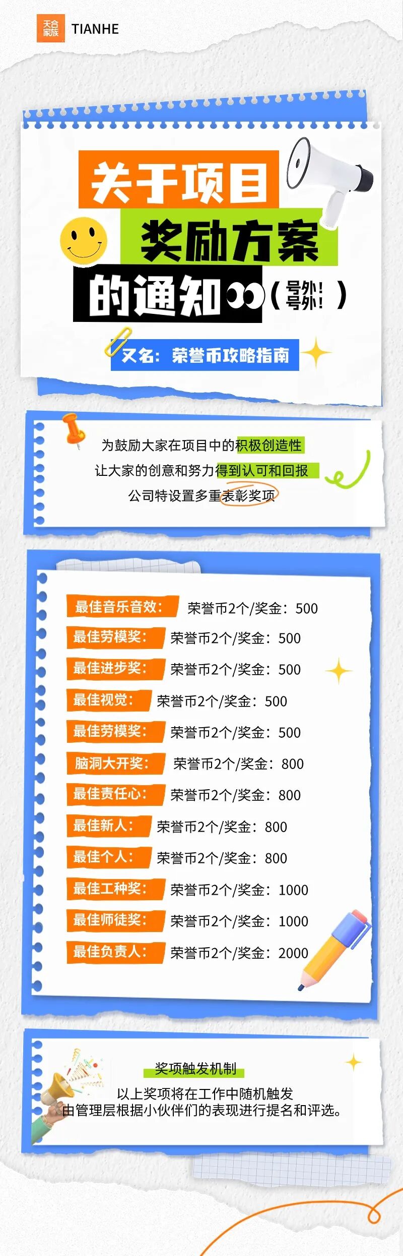 2024年6月26日天合项目奖励方案出炉,设立创新激励机制,旨在激发团队创造力,打造优质内容,推动公司持续创新与进步。不断优化内部管理体系,以期在新的一年里达到更高成就。