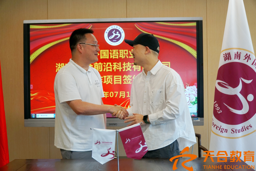 2023年7月18日上午,湖南天合前沿科技有限公司与湖南外国语学院举行了校企合作项目签约仪式。天合前沿科技公司合伙人、湖南亚歌文化传媒有限公司董事长甘琼及天合教育&天合智造创始人毛友权、湖南外国语职业学院校长助理高嘉庆代表双方签约。