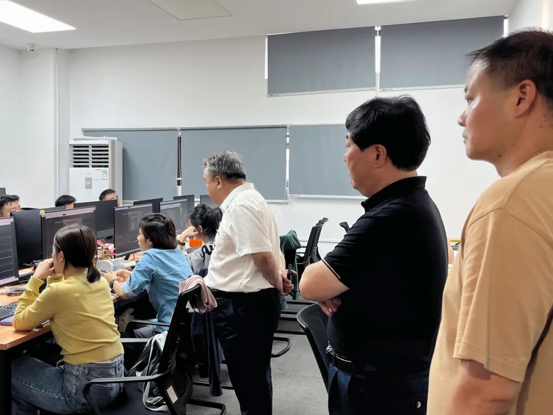 接着,校领导一行移步至四楼,分别参观了天合教育教学区和天合盛视新媒体板块。正在进行的天合课堂,吸引了一众老师的目光,简德彬校长更是深入课堂进行旁听,沉浸式感受了学生们的上课氛围。