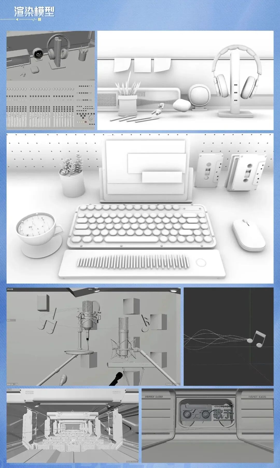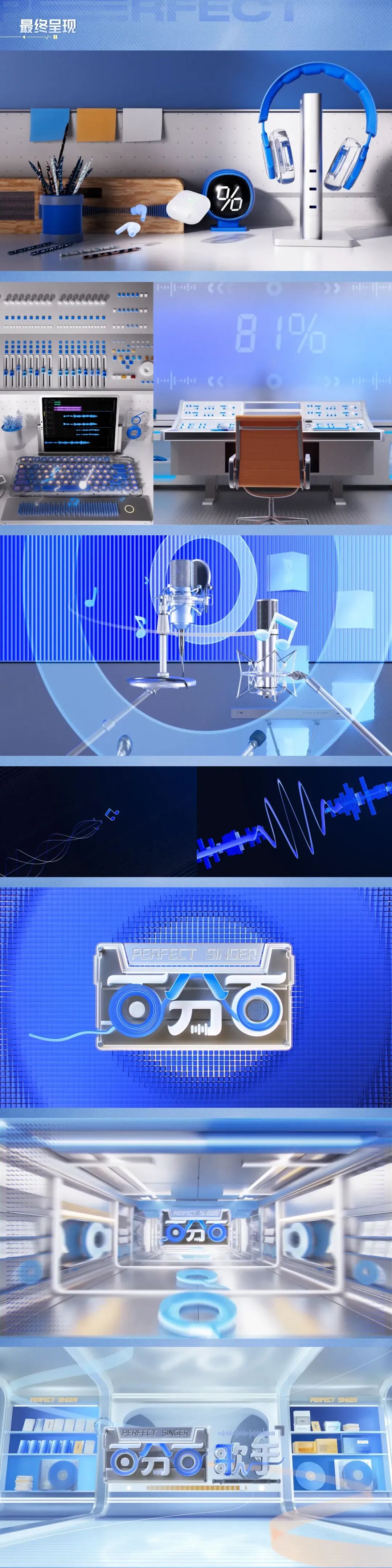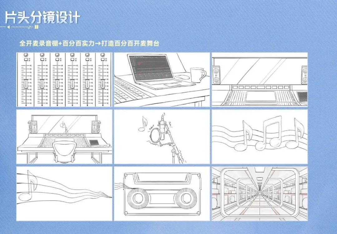 绘制录音棚、调音台、收音麦克风、音轨、音符等主要元素模型,贯穿节目主旨“全开麦录音棚+百分百实力→打造百分百全开麦舞台”
