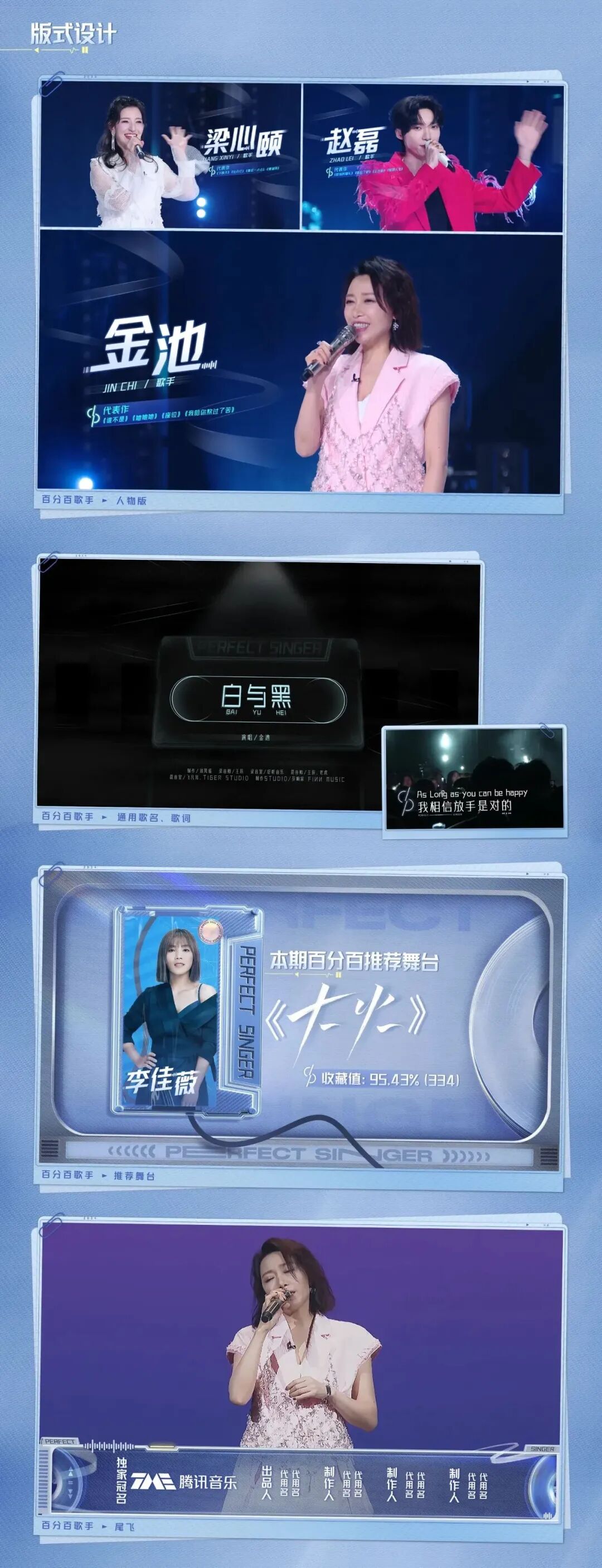 人名版式一般放在歌手身边两侧,其中将人名放大,旁边用人名拼音、身份以及代表作小字点缀。人名中加入声波元素,代表作所用文字框融合“%”元素,整个版式后方虚化飘动着磁带的带基薄膜。