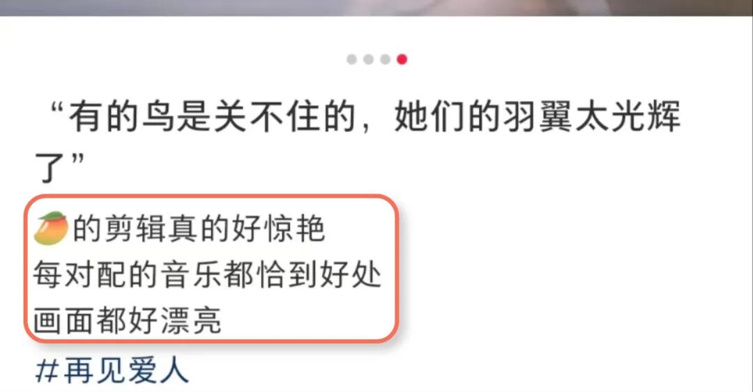 文雅娟(剪辑):因为这一季一直在带领小伙伴一起剪棚内,所以,我觉得自己的高光片段就是上过热搜的预告吧。另外这一季审片量真的很大,我印象最深刻的一件事就是有一次审片从中午一两点,直接审到了后半夜,也特别感谢导演组的支持。留一句话给下一季的小伙伴:《再见爱人》真的是一个很好的项目,在这个项目里大家都学到很多东西。